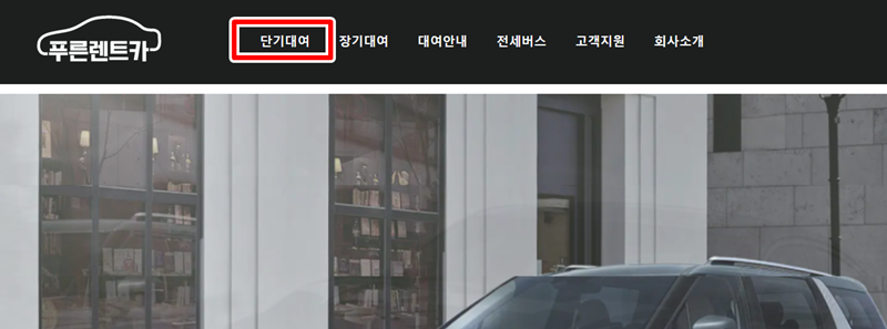 1. '푸른렌트카' 홈페이지에 검색해 접속하면 상단 메뉴에서 '단기대여' 항목을 통해 원하는 기간에 맞춰 차량을 찾아볼 수 있습니다. 여러 종류의 차가 준비되어 있어 선택의 폭이 넓어요.