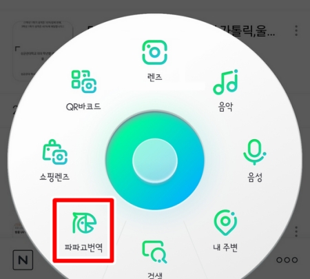 7. 만약 글자 번역이 필요하다면, 동그란 메뉴에서 '파파고번역'을 선택하여 외국어를 한국어로 바꾸는 기능을 사용할 수 있습니다.