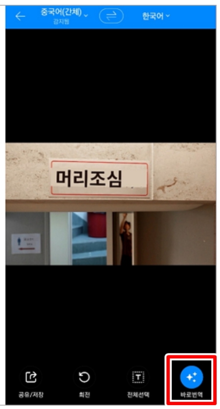 8. 번역하고 싶은 글자를 화면에 비춘 후, 아래의 '바로번역'을 누르면 실시간으로 이미지 위의 글자가 번역되어 나타납니다.