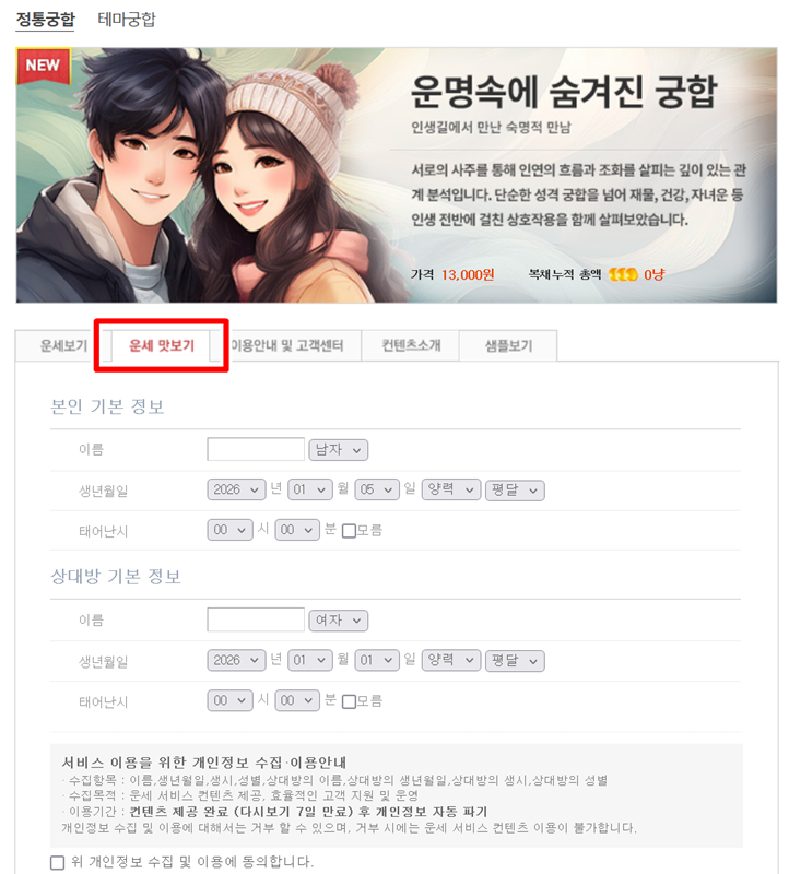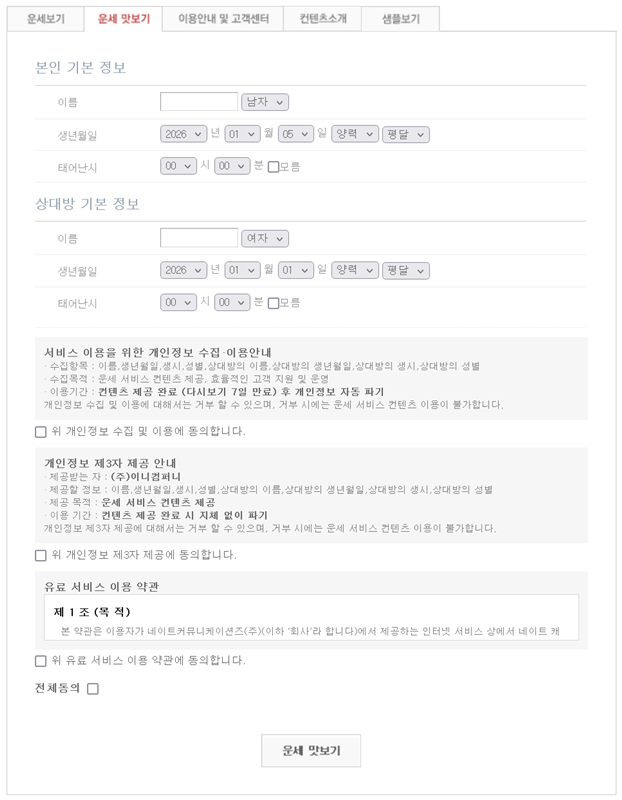 역시 자세한 내용을 보기 위해서는 이름과 성별은 물론, 태어난 연월일시까지 정확하게 기입해야 했습니다. 띠나 별자리만으로 보던 것과는 달리 더 상세한 정보가 필요했습니다. 저와 상대방의 정보를 빠짐없이 모두 넣고, 개인정보 수집 및 이용에 대한 동의 절차를 거치고 나니 드디어 결과를 확인할 수 있었습니다.