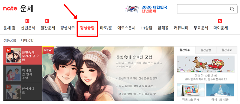 간단한 풀이를 보고 나니 조금 더 깊이 있는 내용이 궁금해졌습니다. 그래서 다른 곳을 찾아보다가 네이트 운세에서 제공하는 '평생궁합'이라는 것을 발견했습니다. 평생에 걸친 인연의 흐름과 조화를 분석해 준다고 하니 호기심이 생겨서 어떤 내용인지 한번 자세히 살펴보기로 마음먹었습니다.