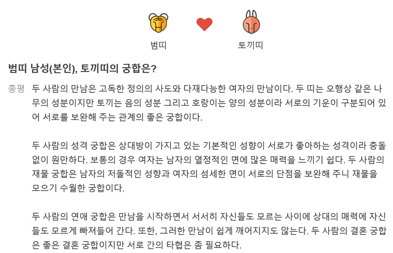 예를 들어 제가 범띠 남자이고 상대방이 토끼띠 여자라고 가정하고 관계를 살펴보았습니다. 두 사람의 만남은 고독한 정의의 사도와 다재다능한 여자의 만남이라며 서로를 보완해 주는 좋은 관계라는 총평이 가장 먼저 눈에 들어왔습니다. 단순히 좋다는 말을 넘어 성격이나 기운의 조화에 대해서도 알 수 있어 흥미로웠습니다.