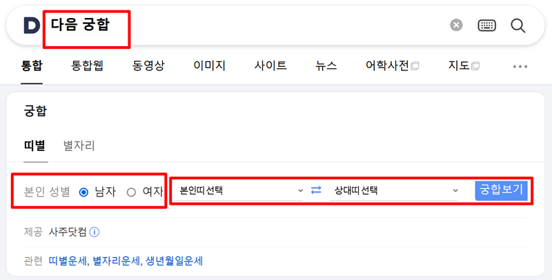 저는 먼저 평소 자주 이용하는 포털 사이트 검색창에 '다음 궁합'이라고 기입하고 찾아봤습니다. 그랬더니 복잡한 과정 없이 검색 결과 가장 위쪽에서 바로 띠별 궁합을 확인할 수 있는 공간이 나타났습니다. 제 성별과 띠, 그리고 상대방의 띠를 차례대로 고르고 결과를 확인하니 신기하게도 바로 풀이가 나타나 편리했습니다.