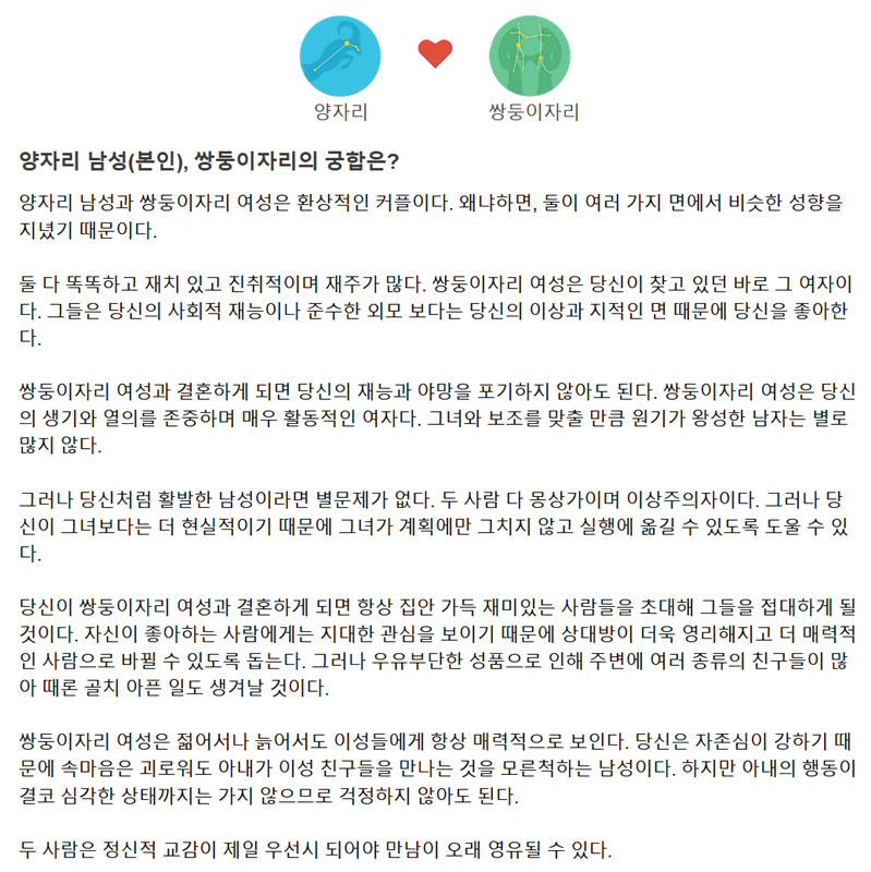 이번에는 제가 양자리 남자, 상대방이 쌍둥이자리 여자라고 설정하고 결과를 확인해 보았습니다. '환상적인 커플'이라는 아주 흥미로운 결과가 나와서 기분이 좋았습니다. 둘 다 똑똑하고 재치 있는 성향이라 잘 맞는다는 내용의 자세한 설명을 읽어보니 고개가 끄덕여지는 부분이 많아 재미있게 느껴졌습니다.