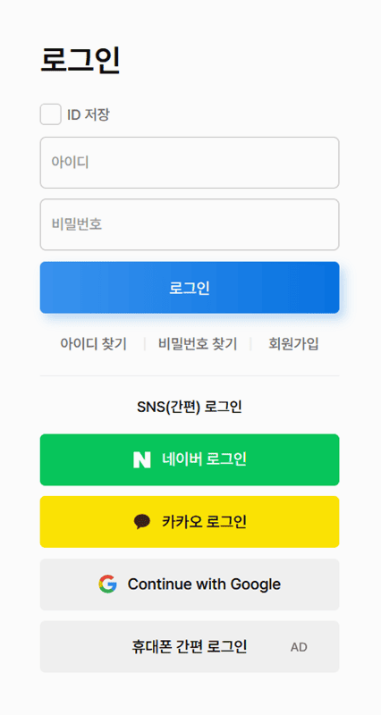 내려받기를 시도하니 로그인을 해야 한다는 안내창이 나타났어요. 이런 서식 홈페이지는 대부분 회원제로 운영되기 때문에 간단한 인증 절차가 필요했습니다. 아이디와 비밀번호를 직접 입력할 수도 있고, 네이버나 카카오 같은 익숙한 소셜 계정을 통해 별도의 가입 절차 없이 바로 들어갈 수 있어서 편리했습니다.