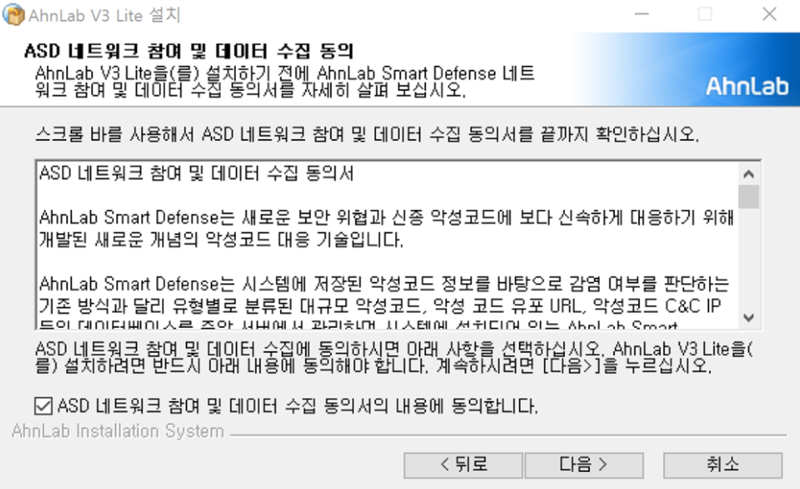 설치 파일을 실행하면 가장 먼저 사용권에 대한 내용이 나와요. 스크롤을 내려 내용을 꼼꼼하게 읽어보시고, 아래에 있는 'ASD 네트워크 참여 및 데이터 수집 동의서의 내용에 동의합니다.'라는 문장 앞 네모난 칸에 표시를 해야 다음 단계로 넘어갈 수 있어요. 동의하신다면 표시를 하고 '다음'을 눌러 진행해주세요.