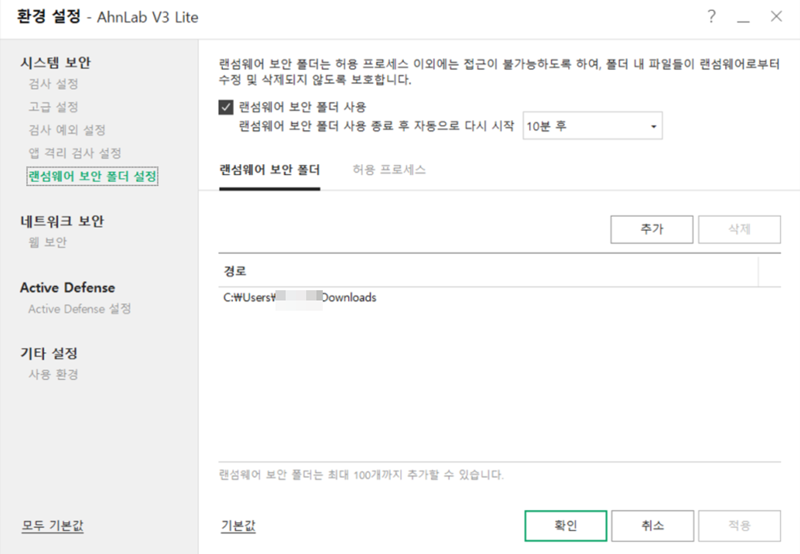 더 확실하게 내 자료를 지키고 싶다면 보호할 공간을 직접 지정할 수도 있어요. 안티랜섬웨어 메뉴의 '랜섬웨어 보안 폴더 설정'으로 들어가면 되는데요. 자주 사용하는 문서나 사진이 담긴 곳의 경로를 추가해두면 허용되지 않은 접근을 막아주니 더욱 든든하죠. 최대 100개까지 추가할 수 있다고 하니 넉넉하게 활용할 수 있어요.