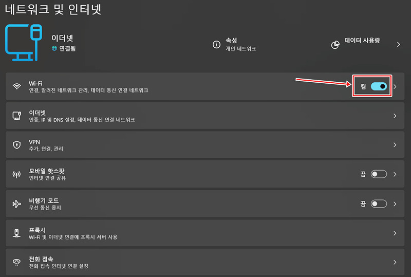 '네트워크 및 인터넷' 화면으로 들어오셨다면, 맨 위에 'Wi-Fi' 항목이 보이실 거예요. 현재 와이파이가 켜져 있는지 혹은 꺼져 있는지 상태를 한눈에 볼 수 있는데요. 만약 이 부분이 꺼져 있다면 당연히 인터넷에 연결할 수 없겠죠. 이럴 때는 오른쪽에 있는 스위치를 움직여서 와이파이를 다시 켜주기만 하면 간단하게 문제가 해결될 수 있어요. 켜져 있는데도 안된다면 한번 껐다가 다시 켜보는 것도 좋은 방법이에요.