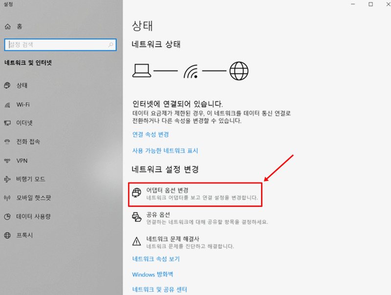 혹시 사용하고 계신 노트북이 구 버전의 운영체제라면 설정 화면이 조금 다를 수 있어요. '네트워크 및 인터넷' 설정으로 들어간 뒤, 화면을 아래로 조금 내려보면 '어댑터 옵션 변경'이라는 항목을 발견할 수 있습니다. 이곳으로 들어가면 현재 내 노트북에 설치된 다양한 네트워크 장치들의 목록을 직접 확인하고 각각의 상태를 제어할 수 있는 더 상세한 설정 화면으로 이동하게 됩니다.