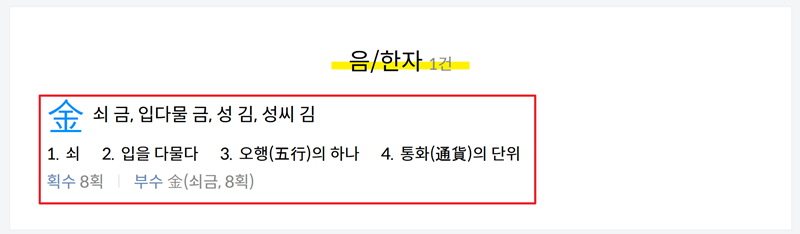검색을 마치면 해당 한자에 대한 상세한 정보가 결과로 나와요. 제가 찾던 '金'자는 '쇠 금'이라는 대표적인 뜻 외에도 '성씨 김'으로도 쓰인다는 걸 알 수 있었어요. 총 몇 획인지, 부수는 무엇인지 같은 세부 정보까지 한 번에 확인할 수 있어서 정말 편리했습니다.