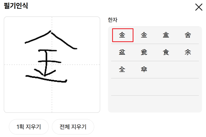 비어있는 공간에 찾고자 하는 한자를 직접 써 내려가면, 오른쪽에 제가 쓴 글씨와 비슷한 모양의 한자들이 추천 목록으로 뜨기 시작해요. 제 성씨인 '김'에 해당하는 '쇠 금(金)'자를 써봤더니, 가장 먼저 정확한 한자가 나타나는 걸 볼 수 있었어요. 여기서 내가 찾던 글자를 선택하면 됩니다.
