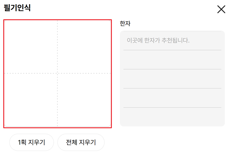연필 모양을 누르면 이렇게 글씨를 쓸 수 있는 네모난 공간이 나타나요. 처음엔 텅 비어있어서 여기에 뭘 해야 하나 싶을 수 있지만, 바로 이 공간에 찾고 싶은 한자를 직접 손으로 그려 넣으면 됩니다. 너무 잘 쓰려고 애쓰지 않아도 괜찮으니, 편안하게 시작해보세요.