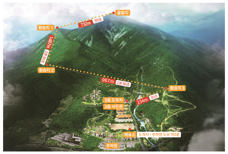 마지막으로 우리가 타게 될 짚와이어 코스를 한번 살펴볼까요. 지도에서 볼 수 있듯이 출발지에서 시작해 환승지를 거쳐 도착지까지 이어지는 긴 코스로 되어 있어요. 각 구간의 길이와 예상 소요 시간이 표시되어 있어 얼마나 짜릿한 경험이 될지 미리 상상해볼 수 있답니다. 아시아 최장 길이를 자랑하는 만큼 멋진 경치와 스릴을 만끽할 준비를 하시면 됩니다.