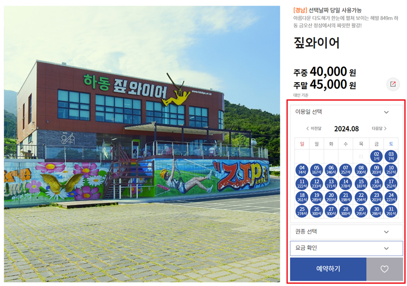 이제 짚와이어 예매 화면으로 넘어왔어요. 주중과 주말 가격을 확인한 뒤, '이용일 선택' 달력에서 원하시는 날짜를 정해주세요. 날짜를 고르면 그 아래로 시간대와 권종을 선택하는 칸이 나타납니다. 인원수에 맞게 표를 고른 후 제일 아래에 있는 '예약하기'를 눌러 다음 단계로 이동합니다. 각 날짜마다 남은 표의 수량도 함께 표시되니 참고하시면 좋아요.