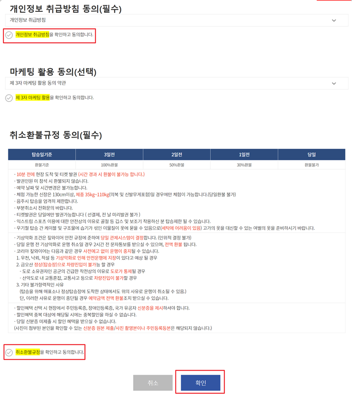 결제에 앞서 몇 가지 동의 절차를 거쳐야 해요. 개인정보 취급방침과 취소환불규정은 필수 동의 사항이므로 내용을 한번 읽어보시고 네모 칸에 체크해주세요. 특히 취소환불규정은 날짜에 따라 환불 비율이 다르니 꼼꼼히 확인하는 것이 중요해요. 마케팅 활용 동의는 선택 사항이니 필요에 따라 정하시면 됩니다. 모두 확인했다면 '확인'을 눌러주세요.