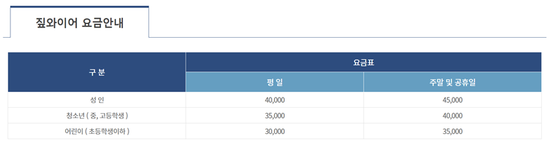 예약을 진행하기 전에 요금표를 미리 확인하면 예산을 짜는 데 도움이 될 거예요. 요금은 성인, 청소년, 어린이로 나뉘어 있고, 평일과 주말 및 공휴일 요금에 차이가 있으니 방문할 날짜에 맞춰 확인해보세요. 예를 들어 성인 기준으로 평일은 40,000원, 주말 및 공휴일은 45,000원입니다.