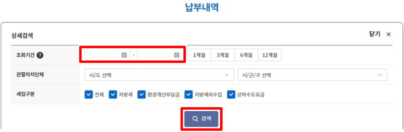상세검색 창이 열리자 조회 기간을 직접 설정할 수 있었습니다. 달력 모양을 눌러 원하는 시작일과 종료일을 지정하고, 필요한 경우 관할 자치단체나 세금 종류를 선택한 뒤 '검색'을 누르니 제가 찾던 기간의 자동차세 납부내역만 정확하게 표시되었습니다.