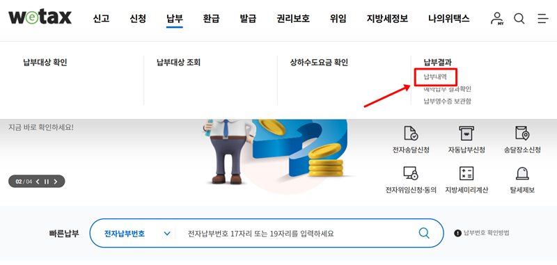 자동차세 납부내역을 확인하기 위해 먼저 포털사이트에서 '위택스'를 검색해 공식 홈페이지로 들어갔습니다. 처음 마주하는 화면에는 여러 메뉴가 있었는데, 저는 납부 기록을 찾아야 했기 때문에 상단에 있는 '납부' 항목을 가장 먼저 눌렀습니다. 이곳에서 지방세와 관련된 대부분의 업무를 처리할 수 있어 보였습니다.