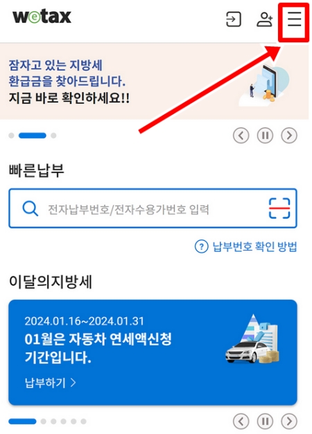 스마트폰을 이용해서도 납부내역을 확인할 수 있었습니다. 위택스 모바일 홈페이지에 접속한 뒤, 화면 오른쪽 상단에 있는 전체 메뉴 아이콘(석 삼 모양)을 눌러주었습니다. PC와 화면 구성은 다르지만 필요한 기능들은 모두 갖추고 있어 편리했습니다.