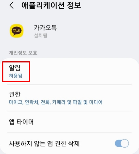 카카오톡 정보를 확인하는 화면으로 들어오니 여러 가지 메뉴가 보였어요. 그중에서 가장 먼저 눈에 띈 것은 '알림' 항목이었어요. '허용됨'으로 표시되어 있어서 처음에는 문제가 없는 줄 알았어요. 하지만 정확한 확인을 위해 이 부분을 눌러서 더 자세한 내용을 살펴보기로 했어요.