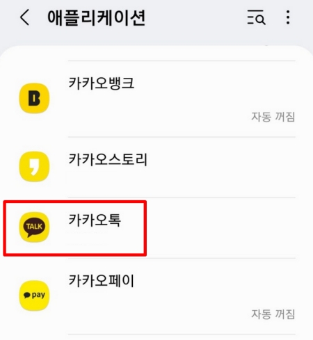 '애플리케이션'으로 들어가니 제 휴대폰에 설치된 수많은 프로그램 목록이 나타났어요. 여기서 스크롤을 내려서 '카카오톡'을 찾았어요. 워낙 많은 프로그램이 있다 보니 찾기 힘들 수도 있지만, 가나다순으로 정렬되어 있어서 금방 발견할 수 있었어요.
