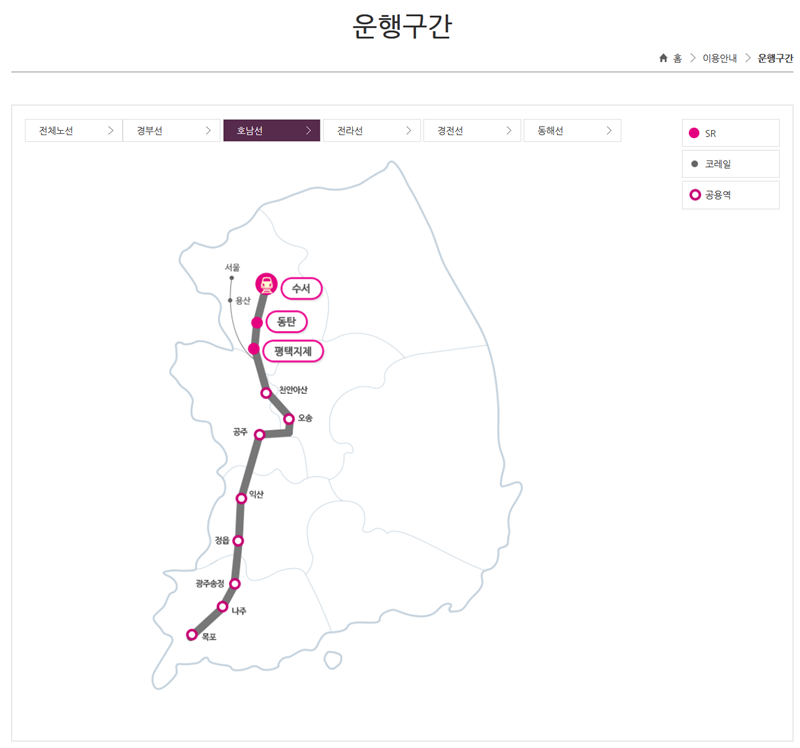 이번에는 '호남선' 탭을 선택해볼까요. 호남선도 경부선과 마찬가지로 수서역에서 출발하여 동탄, 평택지제, 천안아산, 오송역까지는 동일한 경로로 운행됩니다. 오송역에서부터 노선이 갈라져 공주, 익산, 정읍, 광주송정을 지나 목포까지 이어지는 것을 지도를 통해 직관적으로 확인할 수 있습니다.