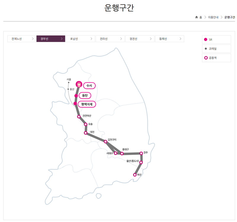 먼저 많은 분들이 이용하시는 '경부선' 탭을 눌러볼게요. 경부선은 수서역을 시작으로 동탄, 평택지제, 천안아산, 오송, 대전, 김천구미, 서대구, 동대구를 지나 신경주와 울산(통도사)을 거쳐 최종 목적지인 부산까지 이어지는 노선입니다. 지도 위에도 해당 경로가 굵은 선으로 명확하게 표시되어 이해하기 쉬워요.