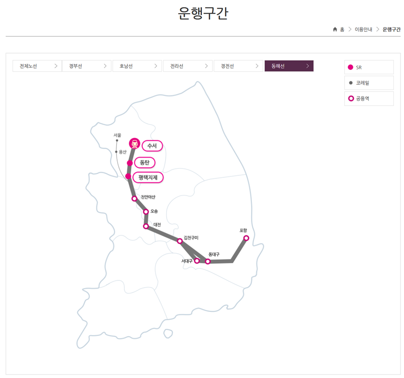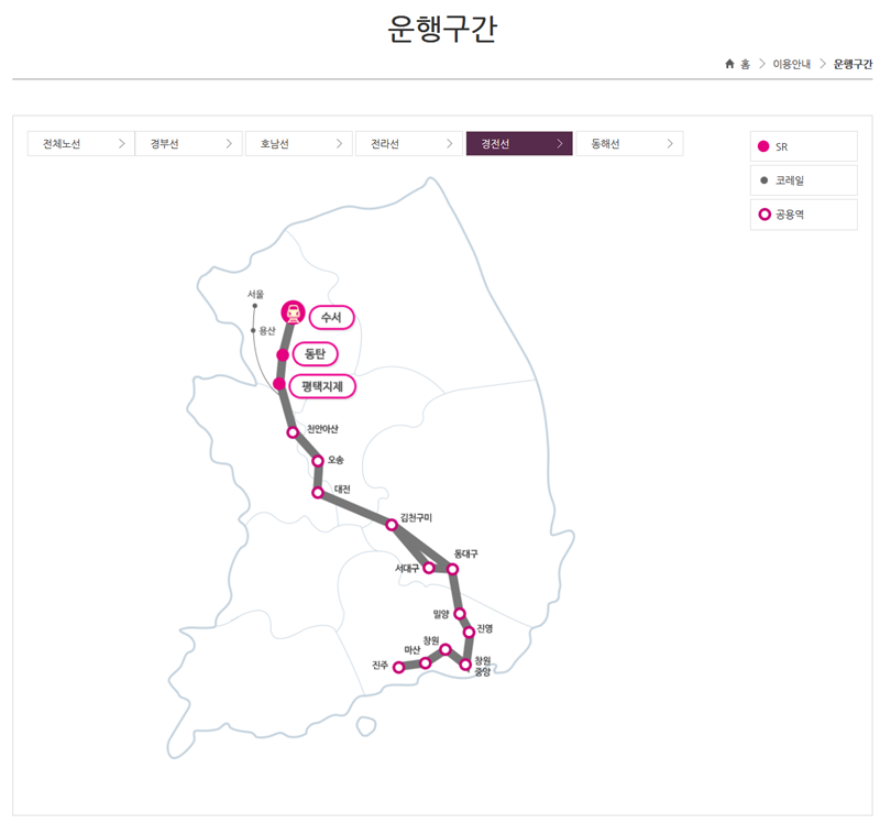 '운행구간'으로 들어가면 우리나라 지도 위에 SRT가 운행하는 모든 역들이 표시된 전체 노선도를 한눈에 볼 수 있어요. 지도 위쪽으로는 '전체노선', '경부선', '호남선', '전라선', '경전선', '동해선'으로 구분된 탭들이 있어서, 특정 노선에 대한 정보만 골라서 보기도 아주 편리하게 되어 있습니다.