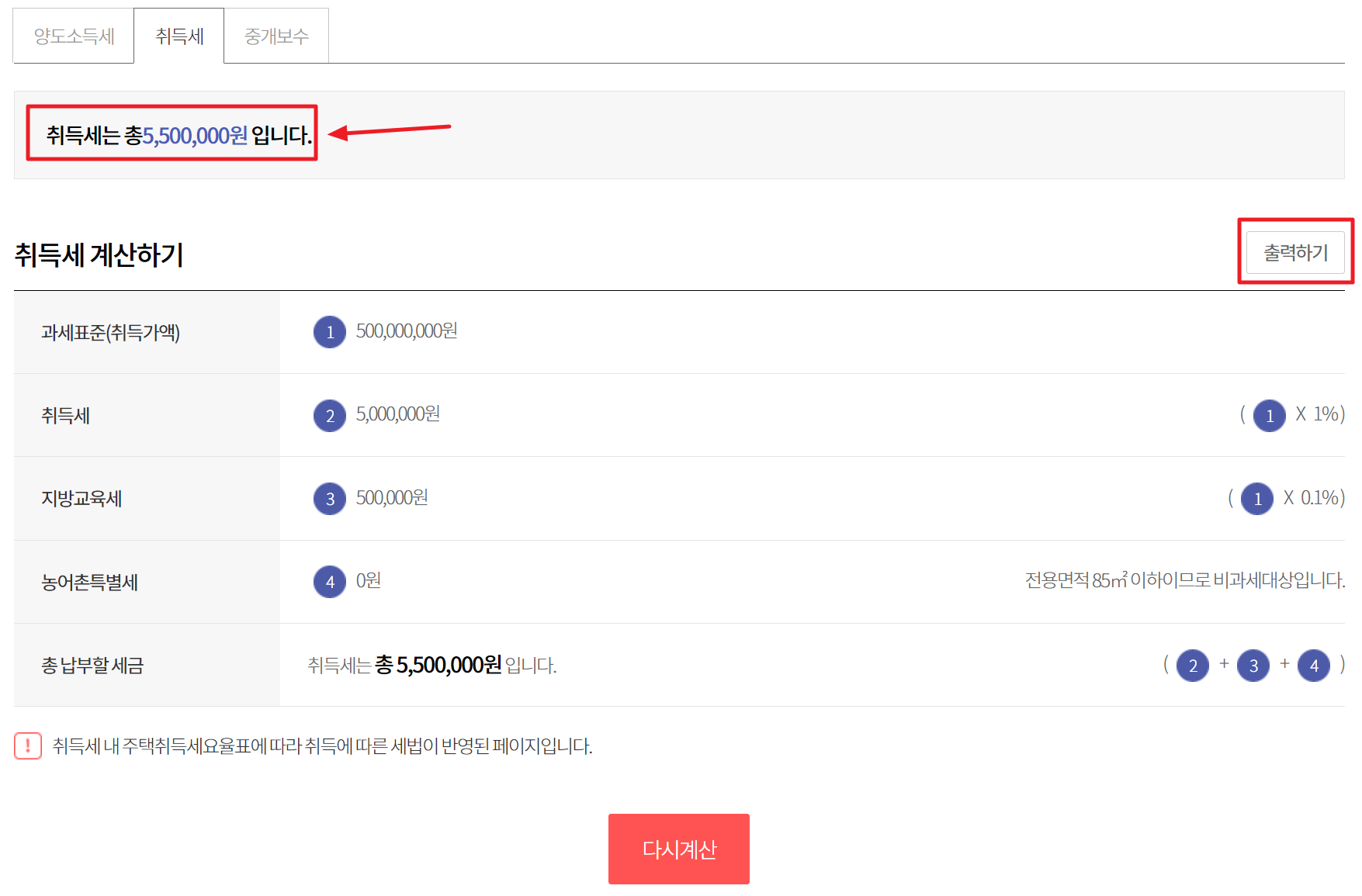 3. 취득방법을 매매,교환으로 선택하고 보유주택수 1주택, 취득가액 5억, 전용면적을 84㎡로 설정했을 때에 납부해야 되는 세금은 총 5,500,000원으로 나왔습니다.