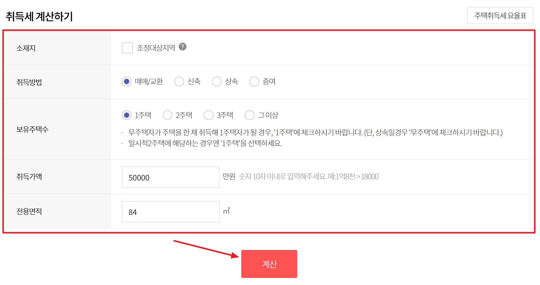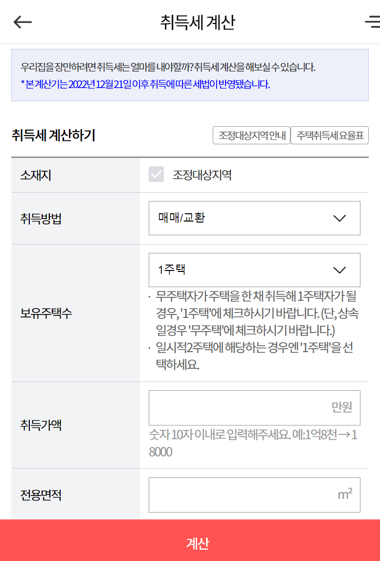 2. 부동산 계산기 화면으로 이동하면 양도소득세와 취득세, 중개보수가 있는데 여기서 취득세를 선택하고 소재지와 취득방법/보유주택수/취득가액/전용면적을 모두 입력한 뒤에 계산하기를 눌러줍니다.
