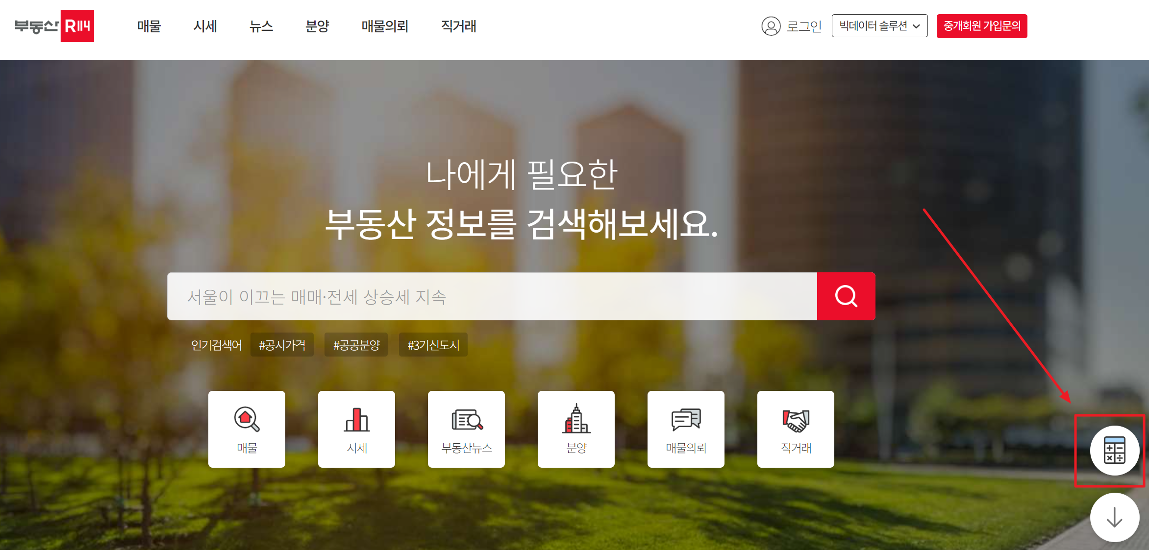 1. 부동산114 사이트에는 무료로 계산 결과를 확인 해볼 수 있습니다. 사이트로 들어가면 오른쪽 하단에 있는 계산기 모양을 눌러주시기 바랍니다.