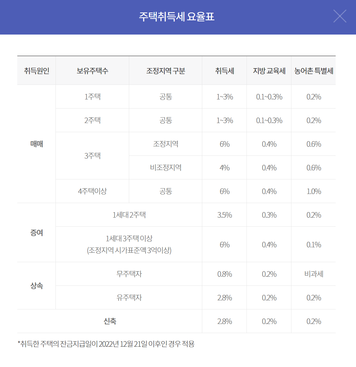 5. 현재 주택취득세 요율표도 나와있는데 매매, 증여, 상속, 신축 시 취득세 요율이 다르기 때문에 이 부분도 체크해주시기 바랍니다. 또한 조정대상지역에 대해서도 안내가 되어있었습니다.