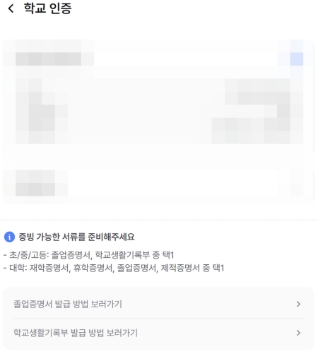 학교 인증은 어떻게 해야 할지 처음에는 조금 막막할 수 있어요. 하지만 화면에 아주 친절하게 안내가 나와 있답니다. 초등학교의 경우, 졸업증명서나 학교생활기록부 중 하나를 준비해서 제출하면 인증이 가능해요. 아래쪽에서는 각 서류를 발급받는 방법도 확인할 수 있어서 어렵지 않게 준비할 수 있었어요.