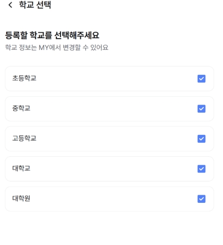 카카오 계정으로 간단하게 접속을 마쳤다면, 이제 내가 찾고 싶은 동창들이 있는 학교를 등록할 차례예요. 화면에는 초등학교부터 대학원까지 학교의 종류가 나열되어 있는데요. 우리는 초등학교 동창을 찾을 것이기 때문에, 목록에서 '초등학교' 항목을 선택해서 다음으로 진행해 주면 돼요.