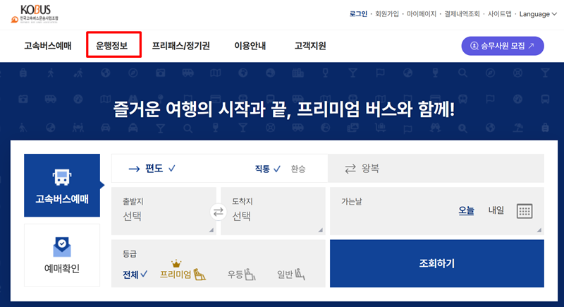 고속버스 시간표를 확인하기 위해 가장 먼저 할 일은 바로 '코버스' 홈페이지에 접속하는 것이에요. 검색 사이트를 통해 쉽게 찾으실 수 있답니다. 홈페이지에 들어서면 예매 화면이 가장 먼저 보이는데요, 우리는 시간표를 조회할 것이기 때문에 상단에 있는 여러 메뉴 중에서 '운행정보'를 찾아 눌러주세요.