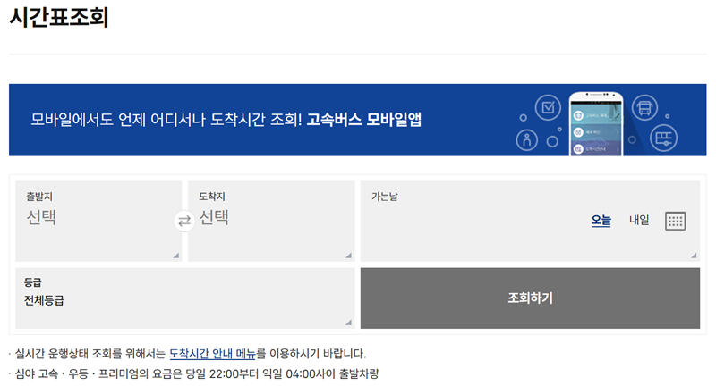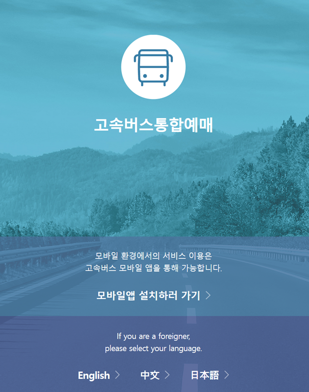 참고로 코버스 홈페이지는 PC 환경에 맞춰져 있어서, 만약 스마트폰으로 접속하게 되면 '고속버스 통합예매'라는 문구와 함께 모바일 응용프로그램 설치를 안내하는 화면이 나타날 수 있어요. 스마트폰으로 시간표를 확인하고 바로 예매까지 진행하고 싶다면, 안내에 따라 응용프로그램을 설치해서 이용하는 것이 훨씬 더 편리하답니다.