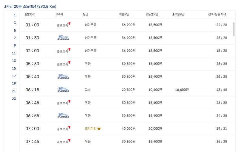 출발지와 도착지, 날짜까지 모두 선택하고 조회를 하면 드디어 해당 노선의 전체 시간표가 나타나요. 출발 시간 순서대로 버스의 종류(우등, 프리미엄 등), 요금, 남은 좌석 수까지 한눈에 볼 수 있어서 정말 편리해요. 이 화면을 보고 원하는 시간대의 버스를 미리 확인하고 예매 계획을 세울 수 있답니다.
