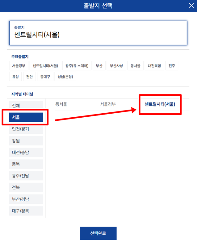 먼저 '출발지 선택'을 눌러볼게요. 그럼 지역별 터미널 목록이 나오는데요, 강남 고속버스터미널은 '서울'에 있으니 왼쪽 지역 목록에서 '서울'을 선택합니다. 그러면 오른쪽에 서울 지역 터미널들이 나타나는데 '센트럴시티(서울)'을 선택하면 돼요.