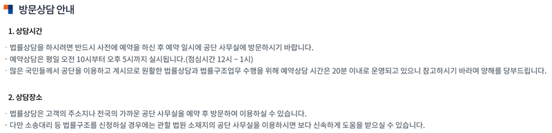 실종자 찾기와는 별개로, 법적인 도움이 필요할 때가 있을 수 있겠다는 생각이 들었어요. 그럴 땐 대한법률구조공단 홈페이지를 이용하면 돼요. 홈페이지 상단 메뉴에서 '법률구조'를 찾고, 그 아래에 있는 '방문상담(예약)'을 통해 직접 만나서 이야기 나눌 시간을 정할 수 있어요. 법률적인 부분은 혼자 해결하기 어려우니 전문가의 도움을 받는 것이 현명해요.