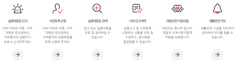 홈페이지에 들어가면 여러가지 기능들이 그림과 함께 알기 쉽게 정리되어 있어요. 여기서 우리가 필요한 것은 바로 '실종아동등 검색'이에요. 잃어버린 가족을 찾기 위한 정보를 조회하고 검색할 수 있는 곳이죠. 마음이 급하시겠지만, 정확한 정보를 입력하는 것이 중요하니 침착하게 다음 단계로 넘어가 주세요.