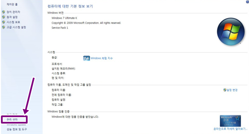 속성 창이 열리면 내 피씨의 여러 정보가 한눈에 들어와요. 여기서 우리는 왼쪽 구석 아래를 유심히 살펴봐야 해요. 거기 보면 아주 작게 관리 센터라는 글자가 보이거든요. 저는 처음에 이걸 못 찾아서 한참을 두리번거렸던 기억이 나네요. 그 글자를 조심스럽게 눌러서 다음 단계로 넘어가 주세요. 복잡해 보이지만 제가 안내하는 대로 따라오시면 전혀 어렵지 않게 진행하실 수 있답니다.