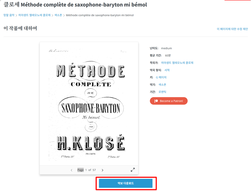 마음에 드는 곡의 상세 화면에 들어오면 곡의 배경 지식과 함께 악보의 첫 장을 미리 확인해볼 수 있어요. 악보의 짜임새나 난이도를 연주 전에 미리 가늠해볼 수 있어서 저도 이 부분을 꼼꼼히 살피며 저의 연주 실력과 잘 맞는지 확인하곤 해요. 화면 아래쪽에 큼지막하게 자리 잡은 하늘색 버튼을 선택하면 그토록 기다렸던 음악 자료를 내 손안에 고스란히 담아낼 수 있답니다. 내가 고심해서 고른 선율이 파일로 저장되는 순간의 뿌듯함은 이루 말할 수 없을 만큼 기분 좋은 일이에요.