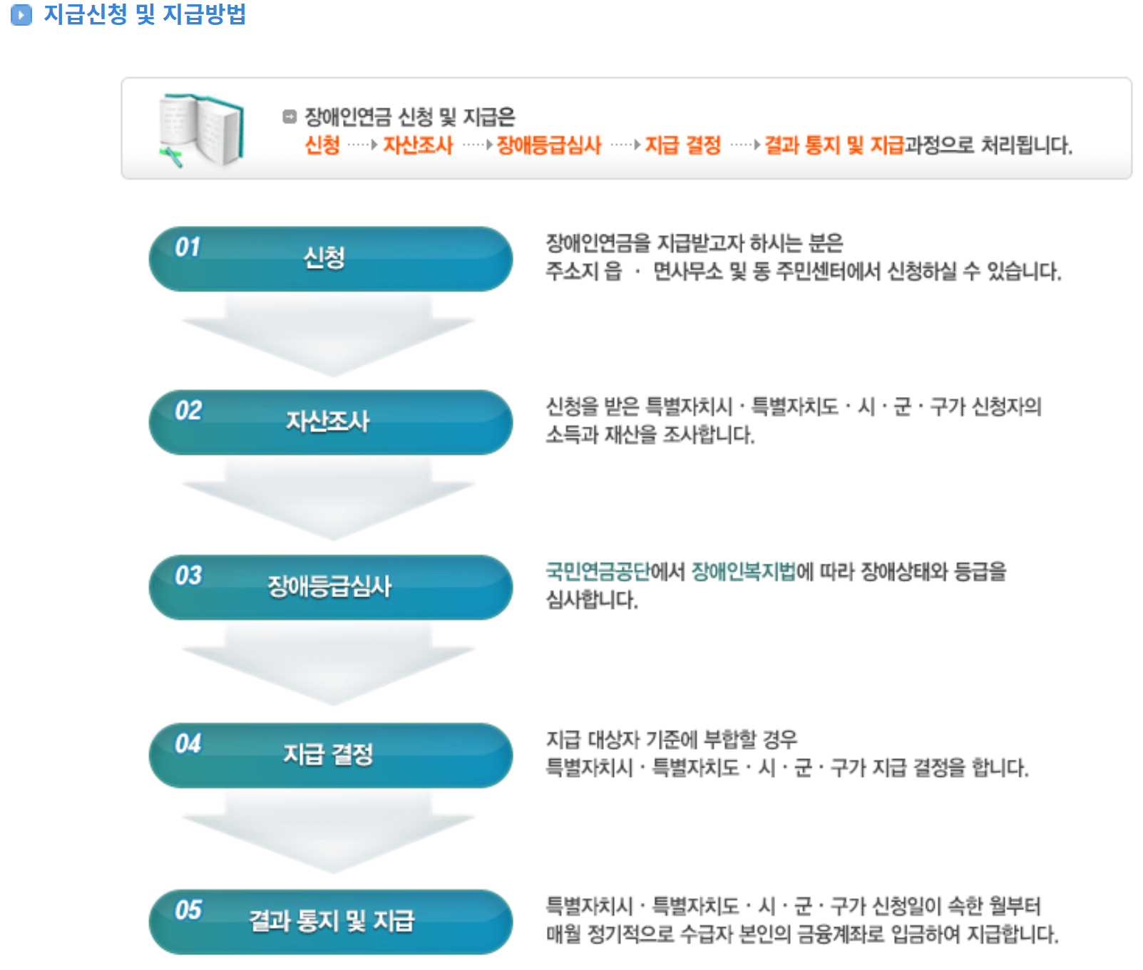 7. 지급신청 및 지급방법은 먼저 주소지의 주민센터에서 신청이 가능하며 신청후에는 자산조사, 장애등급심사 등을 걸쳐 지급이 결정 됩니다. 결과가 나오면 매월 본인의 계좌로 입금이 됩니다.