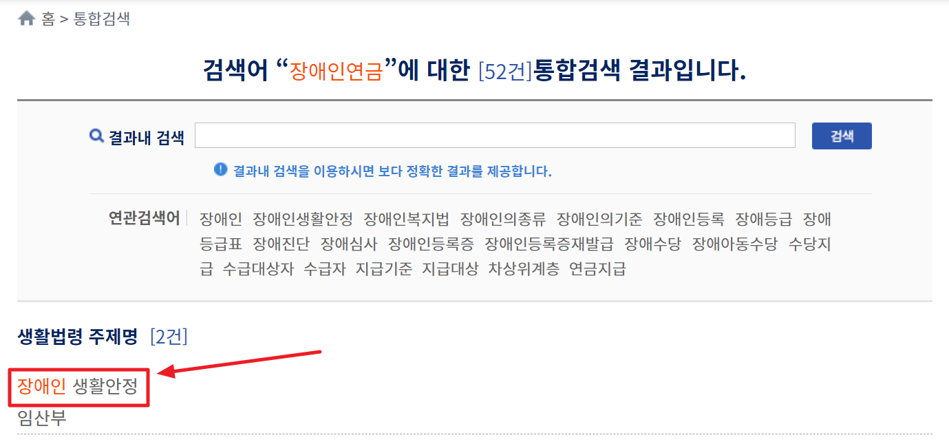2. 검색 결과가 나오면 생활법령 주제명에서 ‘장애인 생활안정’을 눌러 들어갑니다.