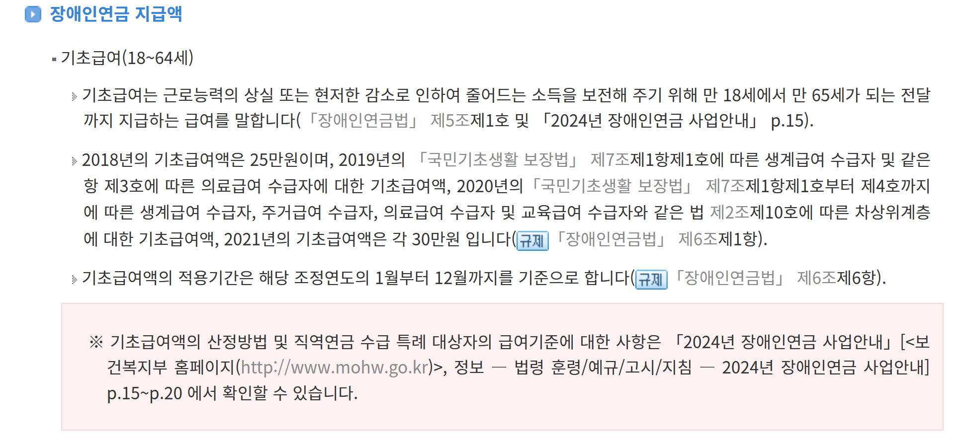 8. 기초급여는 18세부터 64세까지의 장애인을 지원하는 제도로 근로능력이 감소했거나 상실된 경우 소득을 보전해 주는 금액입니다. 2018년 기초급여는 25만원이었으며 2019년부터 2021년까지는 매년 30만원으로 조정되었습니다. 이 급여는 해당 연도의 1월부터 12월까지 지급되며 생계급여와 의료급여 등 다양한 복지 프로그램에 따라 지급 대상이 달라질 수 있습니다.
