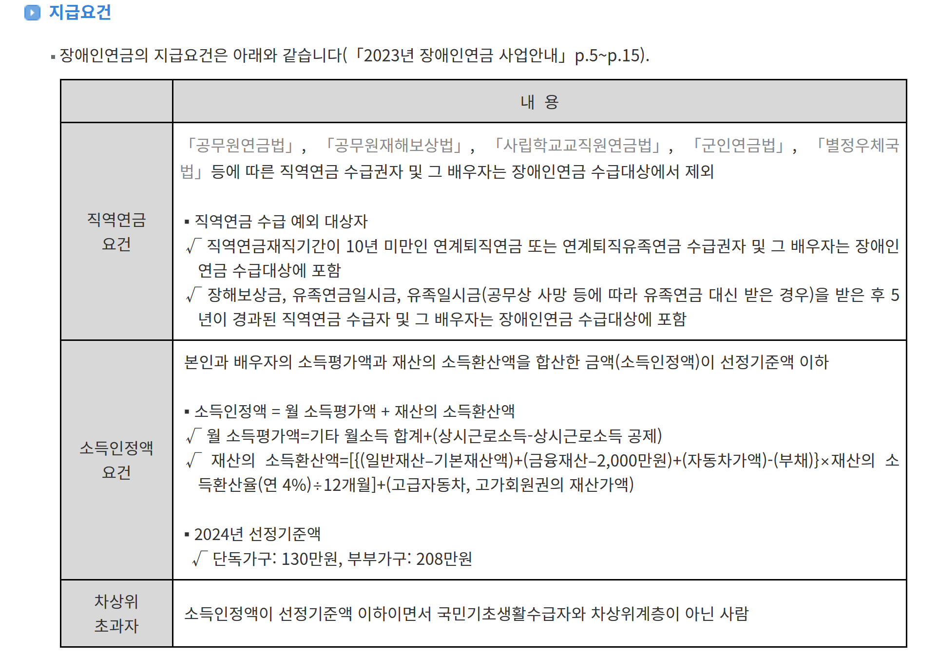 6. 지급요건으로는 직역연금 수급자와 그 배우자는 장애인연금을 받을 수 없고 몇 가지 예외가 있습니다. 예를 들어,직역연금 재직 기간이 10년 미만인 경우나 장해보상금을 받은 지 5년이 지난 경우는 수급 대상에 포함됩니다. 또한 2024년 기준으로 소득인정액이 단독가구는 130만원, 부부가구는 208만원 이하이어야 합니다. 만약 소득인정액이 이 기준 이하이면서 국민기초생활수급자나 차상위계층이 아니면 차상위 초과자로 분류됩니다.