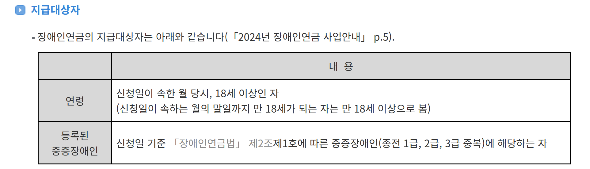 5. 지급대상자는 신청일 당시 18세 이상인자, 신청일 기준으로 중증장애인에 해당하는 자(1급, 2급, 3급) 입니다.