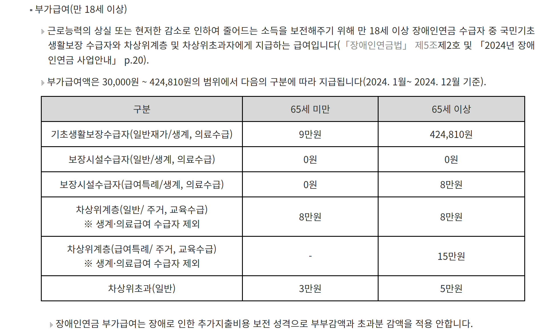 9. 부가급여는 18세 이상의 장애인연금 수급자 중에서 국민기초생활보장 수급자와 차상위계층, 차상위 초과자에게 지급되는 지원입니다. 이 급여는 근로능력이 상실되거나 크게 감소했을 때 소득을 보전하기 위해 마련되었습니다. 2024년 기준으로 부가급여액은 30,000원부터 424,810원까지 차등 지급됩니다.