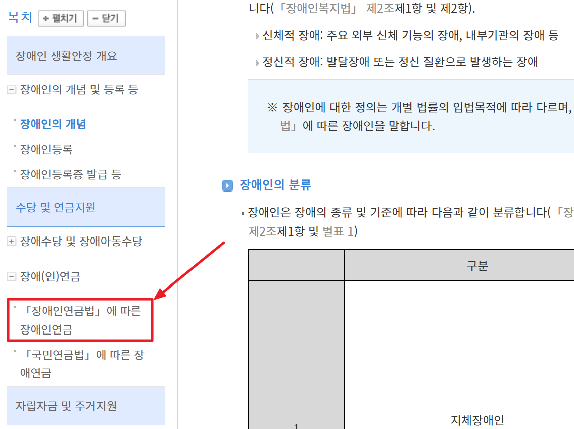3. 그리고 왼쪽의 목차에서 「장애인연금법」에 따른 장애인연금으로 이동합니다.