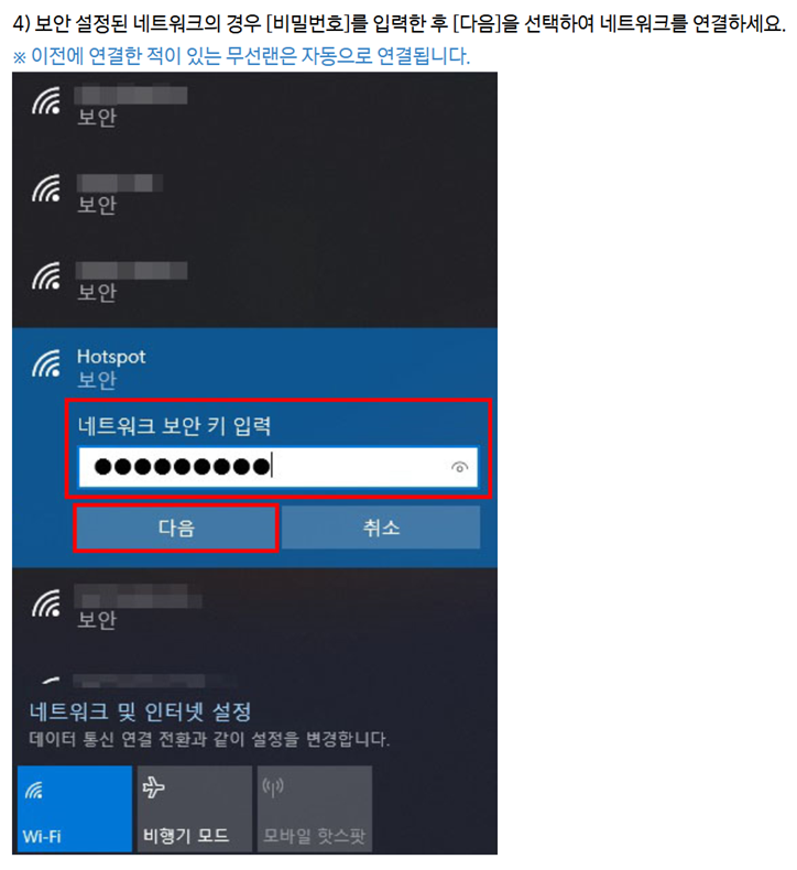 만약 보안이 설정된 장소라면 하얀색 빈칸이 나오면서 네트워크 보안 키를 입력하라는 메시지가 뜰 거예요. 미리 확인해둔 비밀번호를 오타 없이 정성껏 하나씩 채워 넣으시면 돼요. 다 적으셨다면 바로 아래에 있는 다음이라고 적힌 글자를 눌러서 승인을 기다려주면 드디어 인터넷 세상과 마주할 수 있게 돼요.